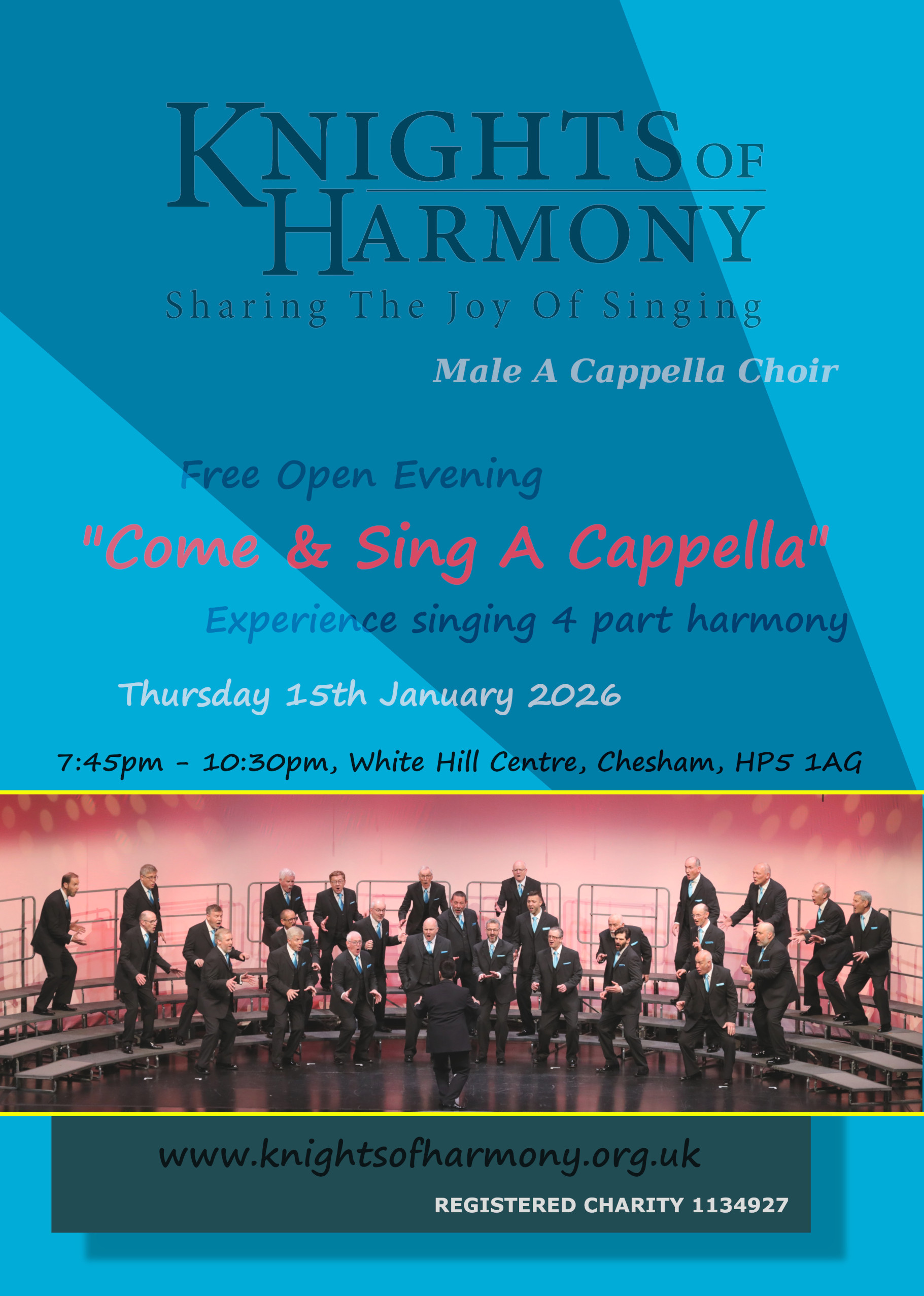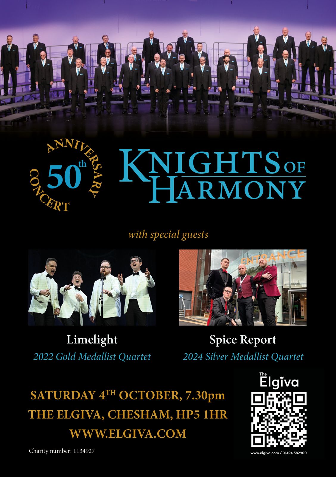 Join the Knights at the Elgiva theatre in Chesham with fantastic guest quartets Limelight and Spice Report, to celebrate 50 years of a cappella singing in our area. Tickets are on sale from the Elgiva website. A beautiful close harmony sound that will lift your spirits, make you laugh and move you to tears...-Saturday 4th October -
